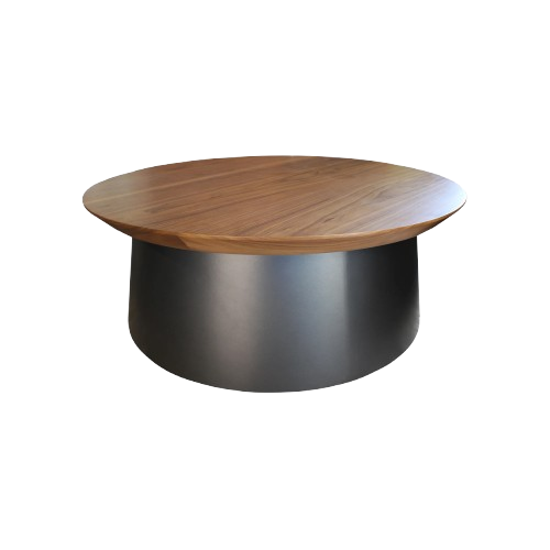 La Mesa central Ochil destaca por su diseño contemporáneo de formas puras y equilibradas. Se compone de una superficie circular de madera de nogal con bordes biselados, lo que le da un aspecto ligero a pesar de su robustez. La base es una estructura cónica invertida en metal con un acabado oscuro mate, creando un contraste sofisticado entre la calidez de la madera natural y la estética industrial del soporte.